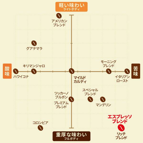 マイルドカルディとブレンドのメインで使用している豆は似ていますが、インドネシア産の豆を加えることで、その力強さを生かした、飲み応えのある仕上がりとなっています。
