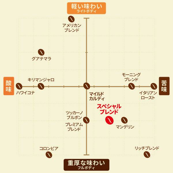スペシャルブレンドは、当店人気No.1の「マイルドカルディ」の味わいを基準に苦味や複雑さを加えて、深みのあるリッチ感を楽しめるコーヒーです。