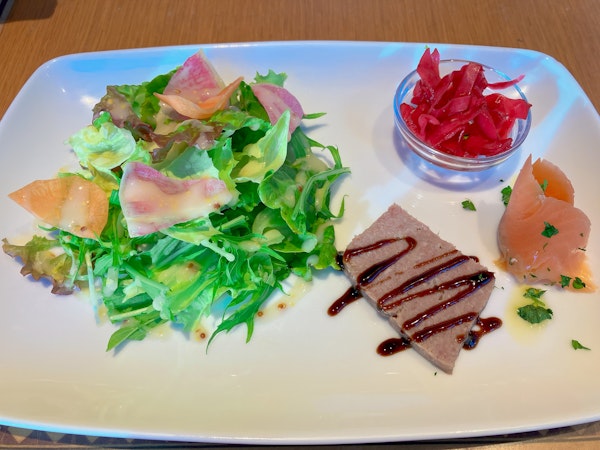 結構豪華ですよね!!サラダ、パテ、スモークサーモン、紫キャベツ(?)のピクルスです🙌