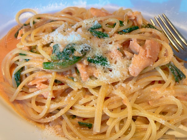私は、スモークサーモンとホウレンソウのトマトクリームパスタを選択。